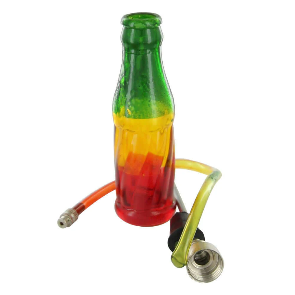 The design is in the shape of a classic soda bottle with three colors of red, yellow, and green. Made in Rasta national colors it stands 5.75 inches tall with a metal mouthpiece attached to the hose.